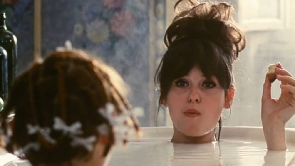 What’s important about Daisies is that it portrays women being unabashedly disgusting. The Maries squish food between their fingers, shove cakes into their mouths, pour liquids all over their faces, and let food decay in their bed. They both may look like the image of femininity — dresses, exaggerated eyeliner, styled hair — but their actions negate this presentation.
