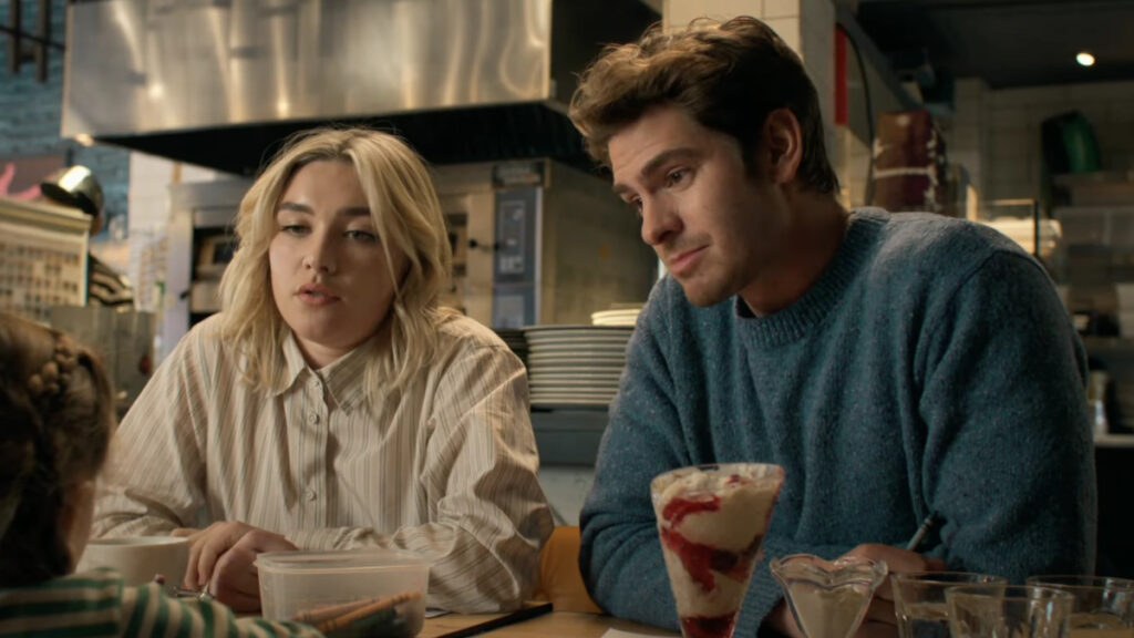 Garfield delivers a nuanced performance, blending vulnerability with a quiet determination that reflects his character’s internal struggle. Pugh is equally compelling, her portrayal radiating warmth and complexity, ensuring her character feels both deeply real and profoundly relatable. Together, they share a magnetic on-screen presence, their connection palpable in every scene. The authenticity of their dynamic elevates the film, grounding its more abstract moments in genuine human emotion.